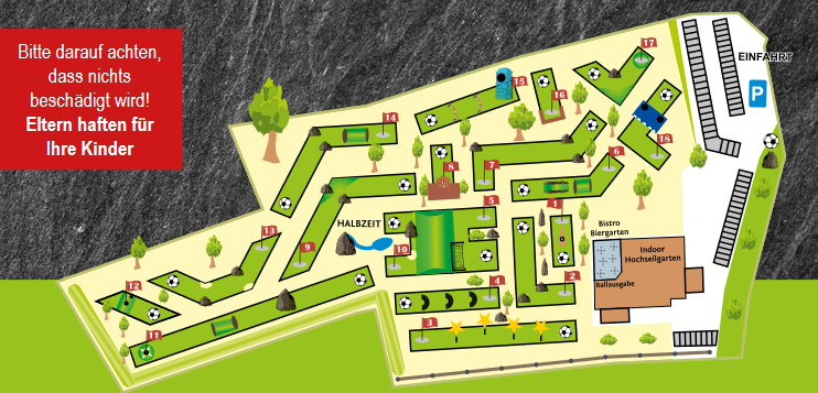 Unsere Bahnen haben verschiedene Mottos und Hindernisse. So gibt es eine Bahn mit mannshohen WM-Sternen, auf denen die Jahreszahlen der vier gewonnen Fußballweltmeisterschaften von 1954, 1974, 1990 und 2014 aufgedruckt sind.
